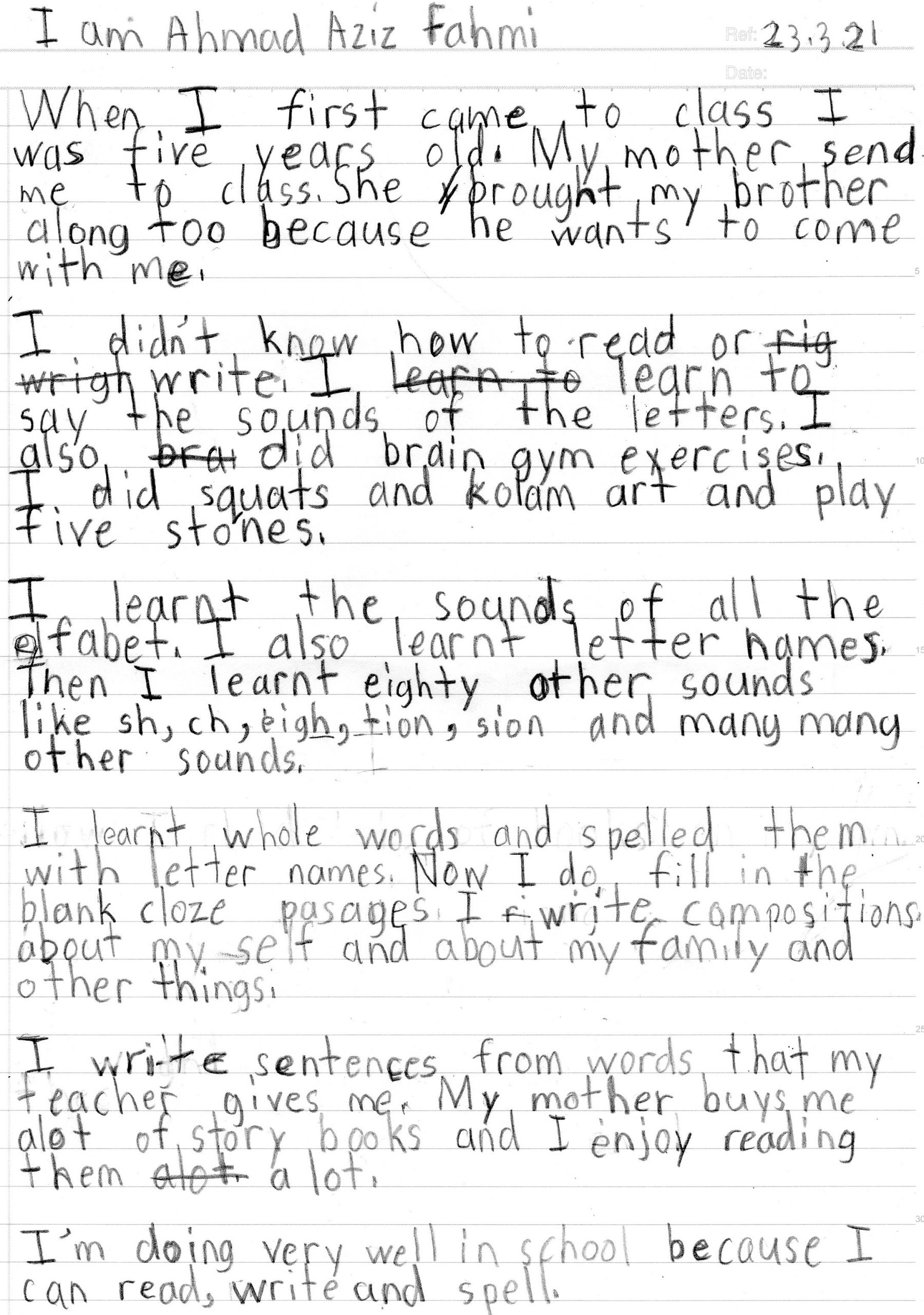 எங்கள் மகள் ஸ்டெல்லா, 3 ஆண்டுகளாக NOD உடன் வகுப்புகளில் கலந்துகொள்கிறார், வாரத்திற்கு ஒரு முறை ஒவ்வொரு வாரமும் ஒன்றரை மணி நேரம். ஒரு பரஸ்பர நண்பரால் நாங்கள் NOD க்கு பரிந்துரைக்கப்பட்டோம், அவர் தனது குழந்தையை மதிப்பீட்டிற்காக அங்கு அனுப்பினார். முதன்மை 1 இல் ஸ்டெல்லா எழுத்துப்பிழை, வாசிப்பு மற்றும் எழுதுவதில் மிகவும் சிரமப்படுவதை நாங்கள் முதலில் கவனித்தோம். ஒரு பொது சீனப் பள்ளியில் 3 வெவ்வேறு மொழிகளைக் கற்றுக்கொள்வதில் அவர் சிரமப்பட்டார். டாக்டர் முல்லையுடனான ஆலோசனை மற்றும் மதிப்பீட்டிற்குப் பிறகு, அவர் மிதமான டிஸ்லெக்ஸியா இருப்பது கண்டறியப்பட்டது. ஆனால் அவள் செய்த மூளை விளையாட்டுகளில் இருந்து அவள் மிகவும் புத்திசாலி என்றும் அவள் வேகமாக கற்றுக் கொள்வாள் என்றும் டாக்டர் கூறினார். ஸ்டெல்லாவின் படிப்படியான முன்னேற்றத்தைக் கண்டோம். ஒரு வருடத்தில், ஸ்டெல்லா தனது ஒலிப்புகளில் மிகவும் மேம்பட்டார், இது அவரது வாசிப்பு, எழுதுதல் மற்றும் எழுத்துப்பிழை ஆகியவற்றிற்கு உதவியது, மேலும் சரியான எழுத்துப்பிழைக்கு வழிவகுக்கும் வார்த்தைகளை உச்சரிப்பதில் டாக்டர் மிகவும் கவனமாக இருந்தார். நானும் என் கணவரும் ஸ்டெல்லாவை இடையில் கோடுகளை வரைந்து வார்த்தைகளை உடைத்து, பின்னர் எழுத்துக்களை சேர்த்து வார்த்தை சொல்லுவதைப் பார்ப்போம். அவள் இருந்த இடத்திலிருந்து வெகுதூரம் வந்துவிட்டாள், இப்போது நம்பிக்கையுடன் படிக்கிறாள், நீண்ட வார்த்தைகளை உச்சரிக்கவும் உச்சரிக்கவும் முடிகிறது. இப்போது அவளால் வாக்கியங்களை உருவாக்க முடியும் மற்றும் நல்ல ஆங்கிலத்தில் கட்டுரைகளை எழுதுவது குறிப்பிடத்தக்கது. 2 ஆண்டுகளுக்கு முன்பு டாக்டரின் ஆலோசனையின் பேரில் அவரது பள்ளியை மாற்றினோம், டிஸ்லெக்சிக் குழந்தைக்கு 3 மொழிகளை சமாளிப்பது கடினமானது, எனவே நாங்கள் அவளை ஒரு ஆங்கில மீடியம் பள்ளியில் பதிவு செய்தோம். பள்ளியில் அவளுடைய நடிப்பு மிகவும் நன்றாக இருக்கிறது, அவள் கஷ்டப்பட்டாள் என்பது பள்ளிக்கூடத்திற்குத் தெரியாது. மையத்தின் அர்ப்பணிப்பு மற்றும் கற்பித்தல் அணுகுமுறையால் நாங்கள் ஈர்க்கப்பட்டோம், மேலும் டிஸ்லெக்சிக் குழந்தைகளின் பிற பெற்றோரை NOD இன் உதவியை நாட ஊக்குவிக்கிறோம்.
